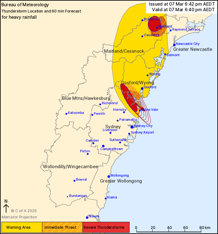 to affect Mona Vale, Morpeth and Tocal by 7:10 pm and Calga, Kurri