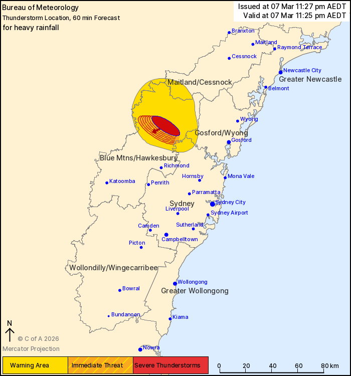 The Bureau of Meteorology warns that, at 11:25 pm, a severe thunderstorm likely to produce heavy rainfall that may lead to flash flooding was detected near the Yengo National Park northwest of St Albans and the Parr State Recreation Area. This thunderstorm is slow moving. It is forecast to affect the Putty Road north of Colo Heights by 11:55 pm and Colo Heights by 12:25 am.