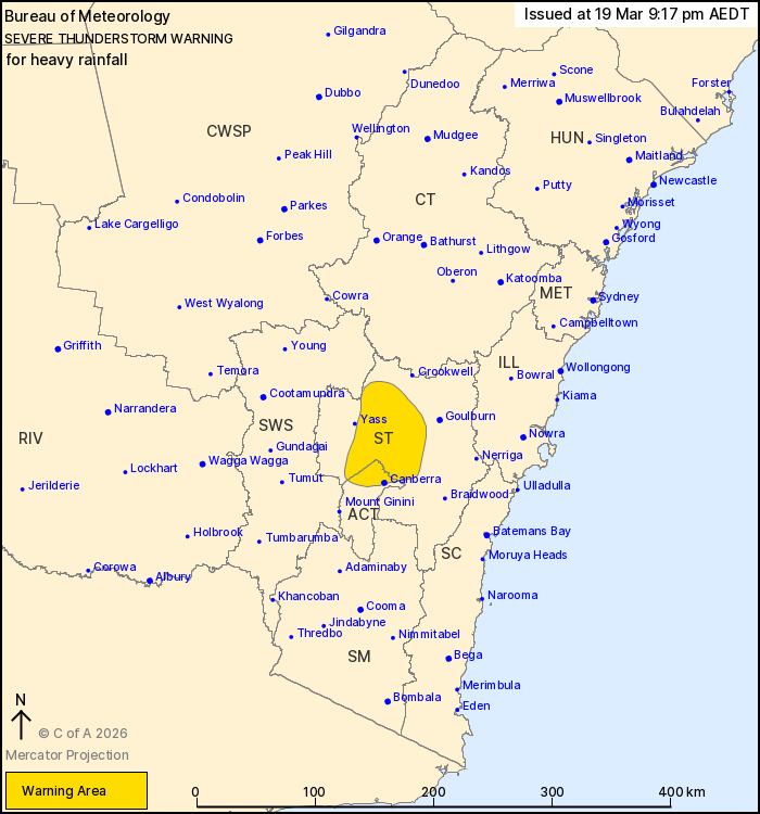 Severe thunderstorms are likely to produce heavy rainfall that may lead to flash flooding in the warning area over the next several hours. Locations which may be affected include Canberra.