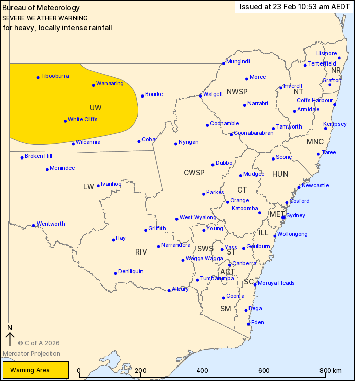 There remains uncertainty around the future movement and strength of the low pressure system over central Australia that is driving this weather. Periods of heavy rainfall may affect western New South Wales until the middle of the week.