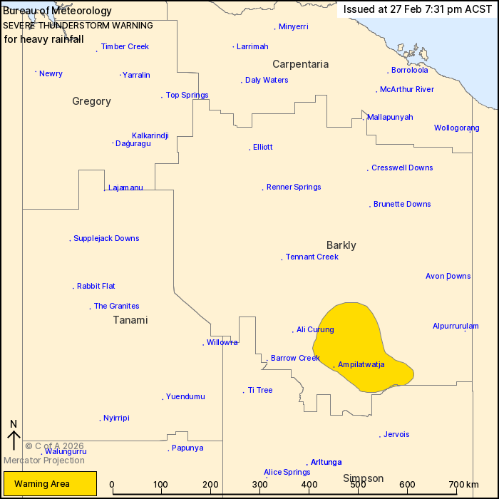 Severe thunderstorms are likely to produce heavy rainfall that may lead to flash flooding in the warning area over the next several hours. Locations which may be affected include Ampilatwatja.