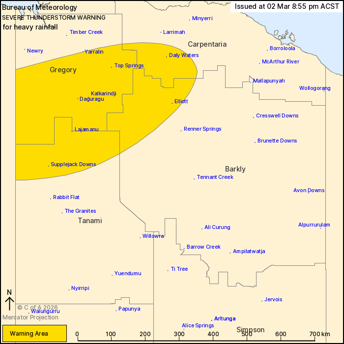 Heavy rainfall about the central Northern Territory tonight.