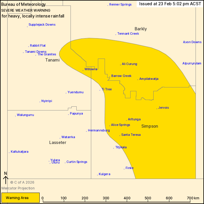 In Alice Springs: HEAVY RAINFALL which may lead to FLASH FLOODING is possible from this evening and through the overnight period. Six hour rainfall totals between 20 and 40 mm are likely, possibly reaching 60 mm.