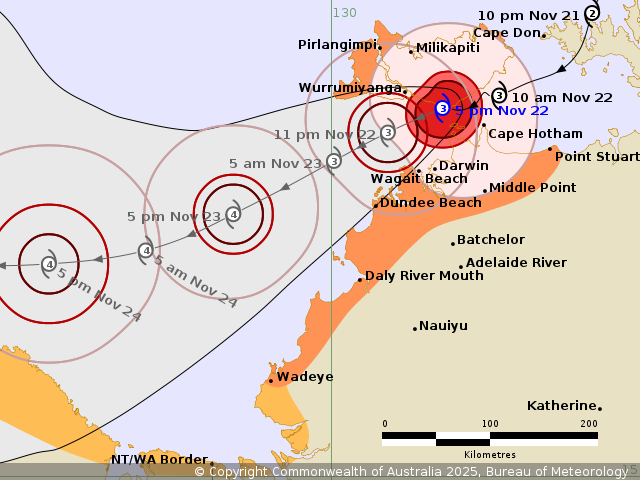 VERY DESTRUCTIVE WIND GUSTS to 205 km/h are occurring along the south coast of Melville Island, extending to Bathurst Island with a chance of reaching Wurrumiyanga this evening. Very destructive wind gusts are likely about exposed coastal sites northeast of Darwin (including Gunn Point and Cape Hotham) but the risk at Darwin is assessed as low.