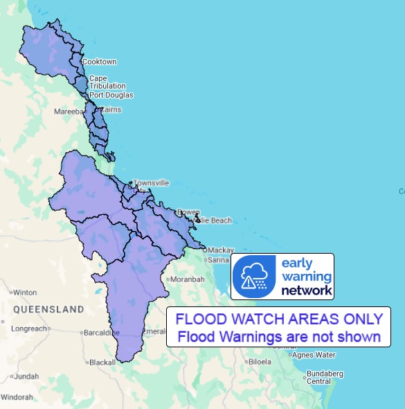 Elevated river levels and areas of flooding are occurring in catchments across the North Tropical Coast. Rainfall from later in the week is likely to cause minor to major flooding from later this week across the Flood Watch area.