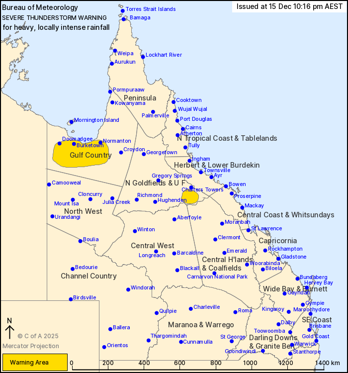Severe thunderstorms are likely to produce heavy rainfall that may lead to flash flooding over the next several hours in parts of the Gulf Country district. Locations which may be affected include Burketown, Normanton, Doomadgee, Augustus Downs Station, Donors Hill Station and Gregory Downs Station.