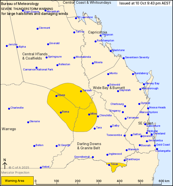 3 cm hail was reported north of Goondiwindi at around 6:30 pm