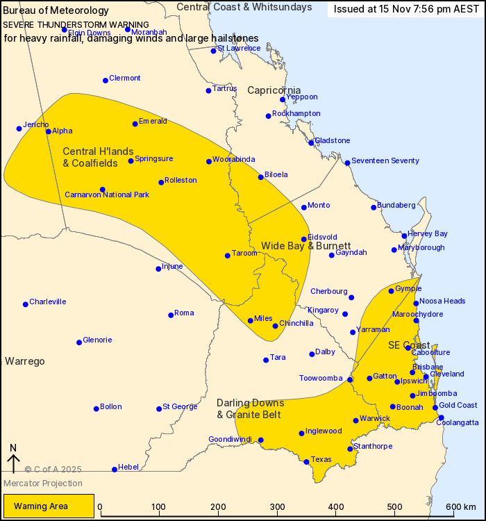 Severe thunderstorms are likely to produce heavy rainfall that may lead to flash flooding, damaging winds and large hailstones in the warning area over the next several hours. Locations which may be affected include Warwick, Gold Coast, Toowoomba, Brisbane, Maroochydore, Gympie, Emerald, Ipswich, Cleveland, Gatton, Jimboomba, Coolangatta, Stanthorpe, Caboolture and Goondiwindi.