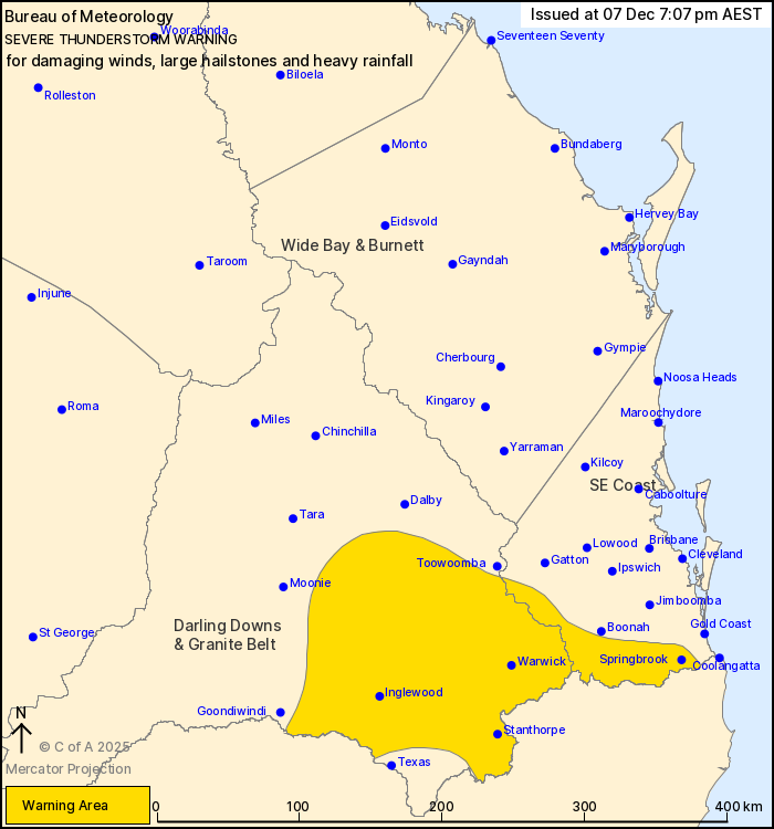 Severe thunderstorms are likely to produce damaging winds, large hailstones and heavy rainfall that may lead to flash flooding in the warning area over the next several hours. Locations which may be affected include Warwick, Stanthorpe, Inglewood, Springbrook, Pittsworth and Millmerran.