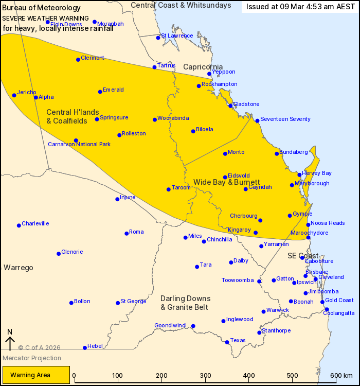 Queensland. Separate Severe Thunderstorm Warnings may be current.
