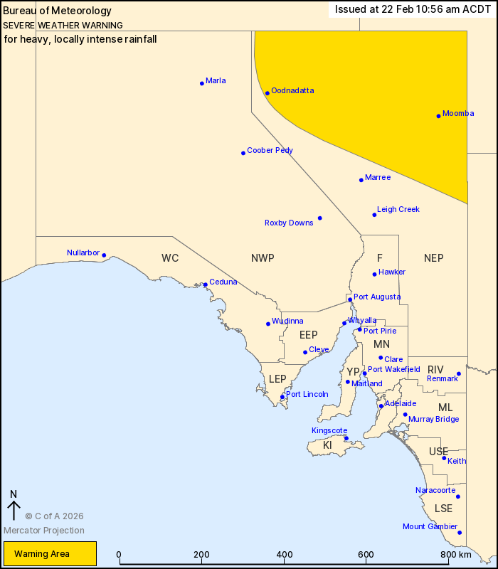 Weather Situation: A slow moving low pressure system located over the southern Northern Territory is surrounded by an extremely humid airmass. This is interacting with an approaching cold front and upper trough to produce widespread rainfall across South Australia, becoming severe about the northeast tonight. The low pressure system is likely to linger in the area for the next several days, bringing further periods of heavy rainfall.