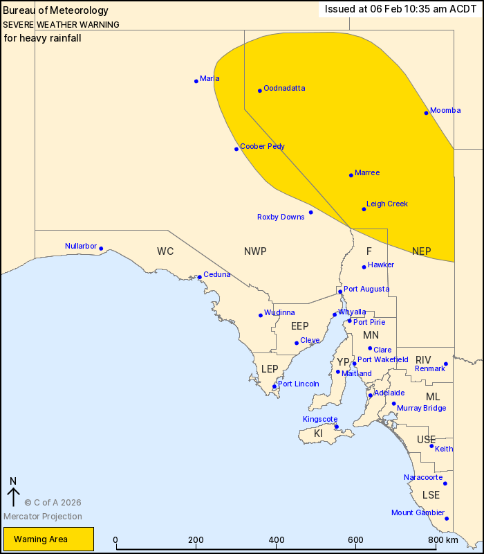 HEAVY RAINFALL which may lead to FLASH FLOODING is forecast to develop about the pastoral districts and northern parts of the Flinders district from Saturday morning. Six-hourly rainfall totals between 20 and 50 mm are likely with localised totals up to 75 mm possible with thunderstorm activity.