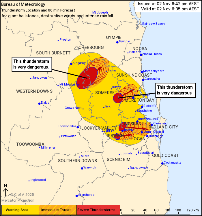 to affect Mount Mee, Wamuran and Woodford by 7:05 pm and