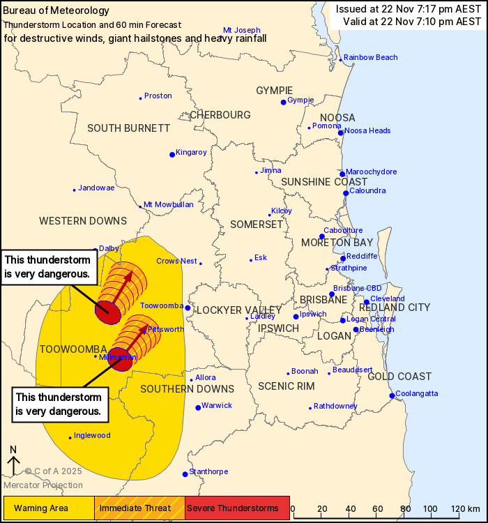 Kincora and the area west of Toowoomba by 7:40 pm and Pittsworth,