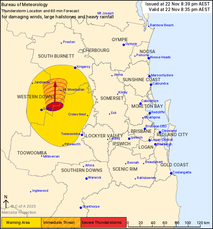 The Bureau of Meteorology warns that, at 8:35 pm, a severe