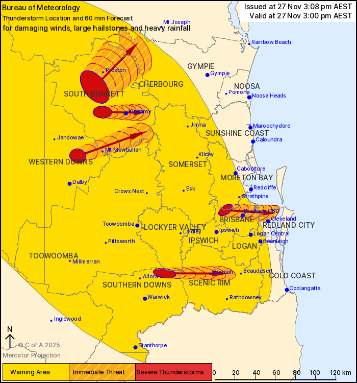 forecast to affect Brisbane CBD, Kingaroy and Mt Mowbullan by 3:30