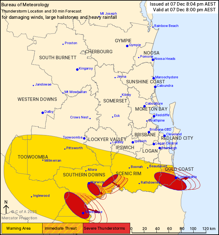 The Bureau of Meteorology warns that, at 8:00 pm, severe