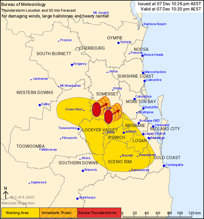 The Bureau of Meteorology warns that, at 10:20 pm, severe