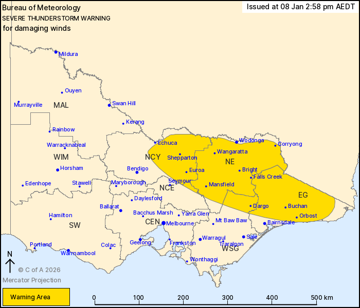 Severe thunderstorms are likely to produce damaging winds in the warning area over the next several hours. Locations which may be affected include Shepparton, Wangaratta, Orbost, Corryong, Bright and Falls Creek.