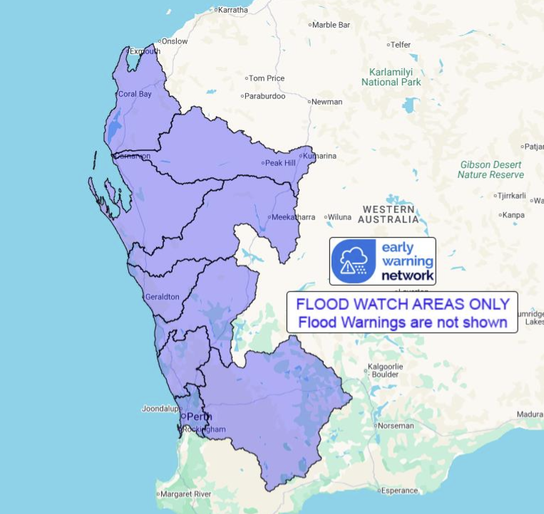 Flood Watch for western parts of the Pilbara, Gascoyne, Central and Lower West Coastal catchments