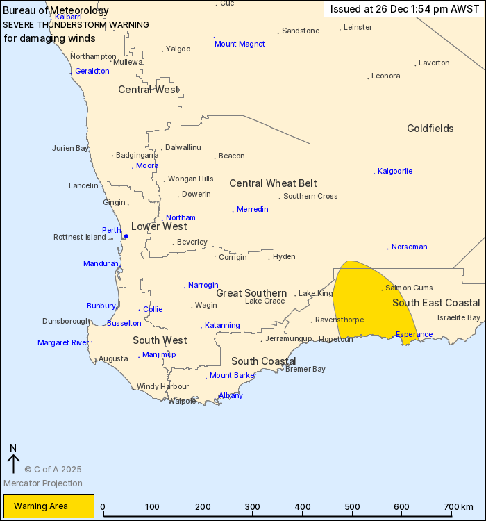 Weather Situation: Severe thunderstorms have developed in a hot and unstable atmosphere around a surface trough that extends through southeastern parts of the South West Land Division. Severe thunderstorms are moving quickly to the southeast and will continue throughout the afternoon as the trough moves eastwards and eventually reaching Esperance later in the afternoon.