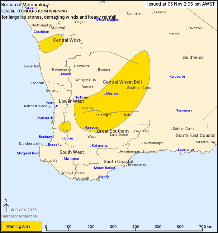 Severe thunderstorms are likely to produce large hailstones, damaging winds and heavy rainfall that may lead to flash flooding over the next several hours in parts of the Great Southern, Central Wheat Belt, Gascoyne and Goldfields districts. Locations which may be affected include Merredin, Narrogin, Corrigin, Hyden, Southern Cross and Beverley.