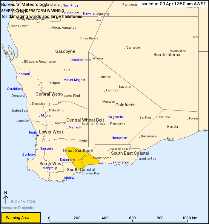 Severe thunderstorms are likely to produce damaging winds and large hailstones in the warning area over the next several hours. Locations which may be affected include Ravensthorpe, Hopetoun, Jerramungup, Lake Grace and Lake King.