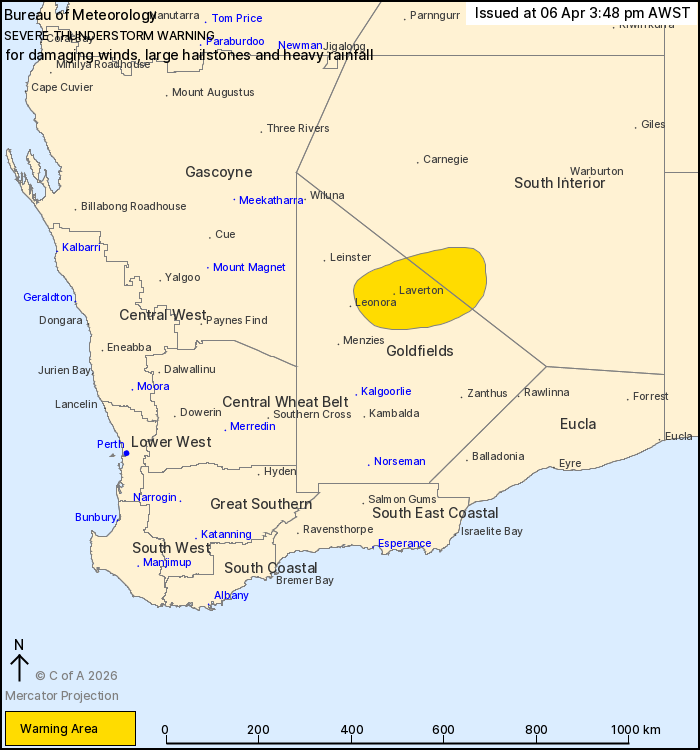 Severe thunderstorms are likely to produce damaging winds, large hailstones and heavy rainfall that may lead to flash flooding in the warning area over the next several hours. Locations which may be affected include Laverton.
