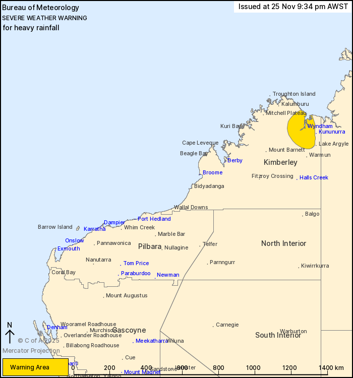 Weather Situation: Ex-Tropical Cyclone Fina is slowly moving inland over the northeast Kimberley, producing heavy rainfall overnight tonight.