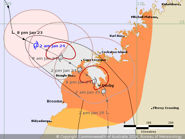 GALES with DAMAGING WIND GUSTS to 120 km/h are possible between Beagle Bay and Kuri Bay from early this morning. Gales may extend south to Derby and towards Broome during Saturday and to adjacent inland areas overnight Saturday night. If the system takes a track further west, gales may extend from Broome to Bidyadanga later Saturday.