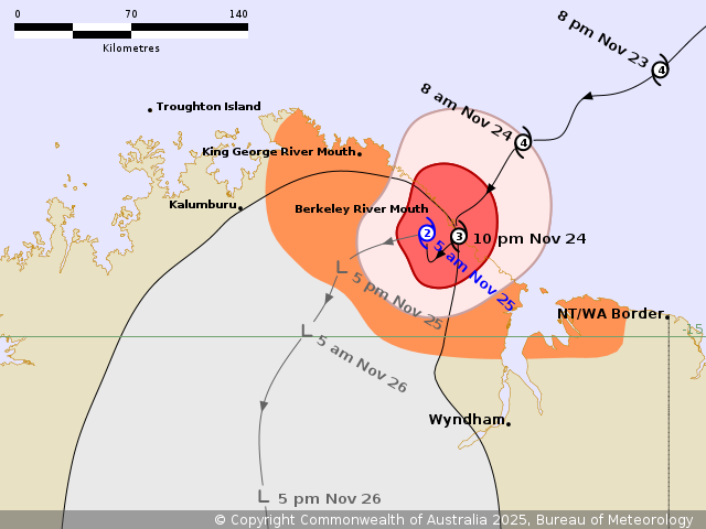 Intensity: Category 2, sustained winds near the centre of 100 kilometres per hour with wind gusts to 140 kilometres per hour.