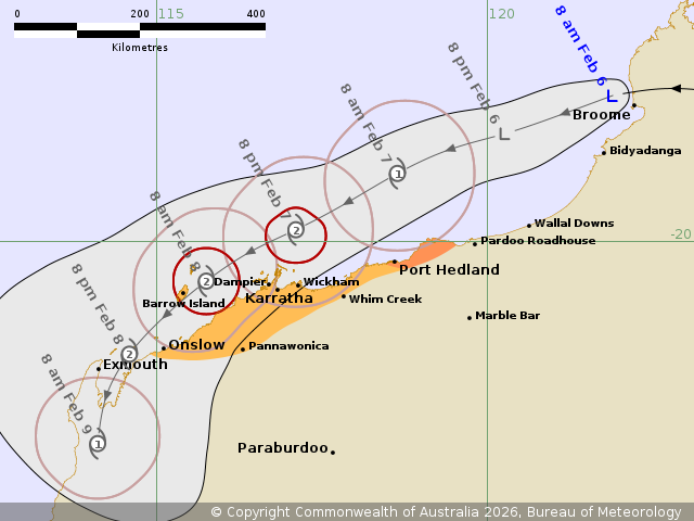 Location: within 30 kilometres of 17.8 degrees South 121.9 degrees East, estimated to be 40 kilometres west northwest of Broome and 445 kilometres northeast of Port Hedland.