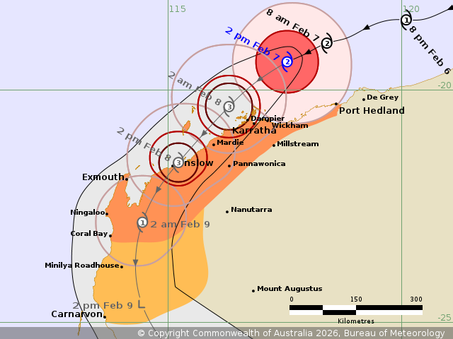 VERY DESTRUCTIVE WIND GUSTS to 220 km/h are possible over the coastal parts of the Pilbara around Karratha, Dampier and Wickham tonight especially if Mitchell moves closer than forecast, extending to Onslow during Sunday as the destructive core of Mitchell moves along the coast.